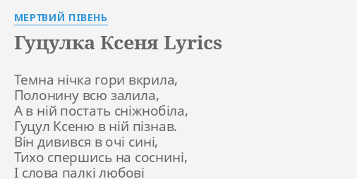 Мертвий Півень - Гуцулка Ксеня Am Dm Темна нічка гори вкрила E Am Полонину всю залила F Dm А в ній постать сніжно-біла E Am Гуцул Ксеню в ній впізнав. Translation of Гуцулка Ксеня Gutsulka Ksenya by Mertvyy Piven Мертвий півень from Ukrainian to Russian Deutsch English Español Français Hungarian Italiano Nederlands Polski Português Brasil Română Svenska Türkçe Ελληνικά Български Русский Српски العربية فارسی. Mertvyy Piven Мертвий півень Текст песни Гуцулка Ксеня Gutsulka Ksenya.