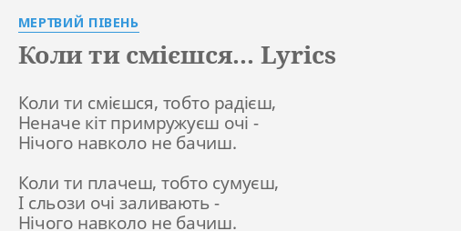 Даний канал - це спроба зберегти та зібрати в одному місці пісні україномовних гуртів що вели свою активну. Verse 1 Cm Am Коли ти смієшся тобто радієш E Gm Неначе кіт примружуєш очі -- Cm Am E Gm Нічого навколо не бачиш. Cm Am Коли ти смієшся тобто радієш E Gm Неначе кіт примружуєш очі -- Cm Am E Gm Нічого навколо не бачиш.