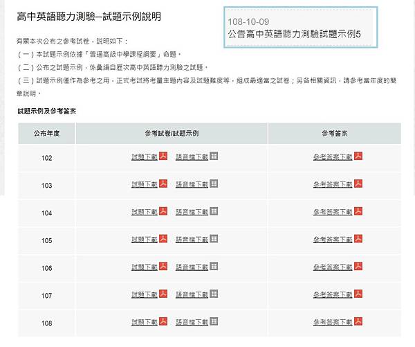 109英聽必備7年參考試卷一次下載- 英聽測驗 108英聽題目 大考中心已於今年10月公布最新的108年英聽參考試卷試題示例參考試卷的難易度與考試題型皆與正式試卷相同可供考生做模擬練習之用.